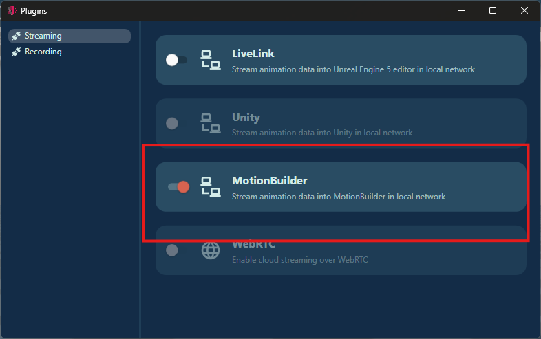 - In Streaming section toggle Motionbuilder