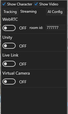- "WebRTC" - streams the 3d animation and voice to go.rplab.online or Unity. If no room id specified one will be generated automatically, you can then paste this room id to go.rplab.online or Unity Plugin