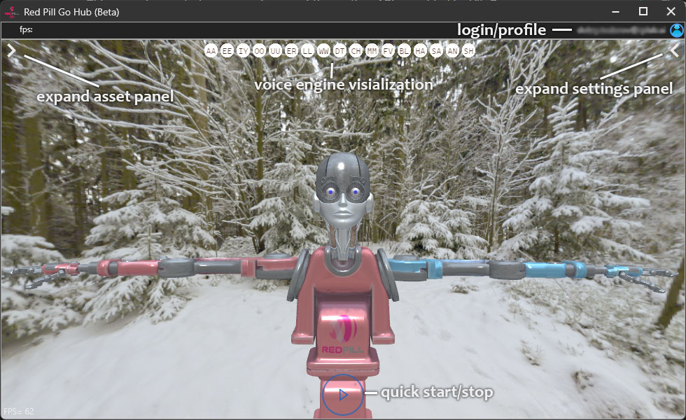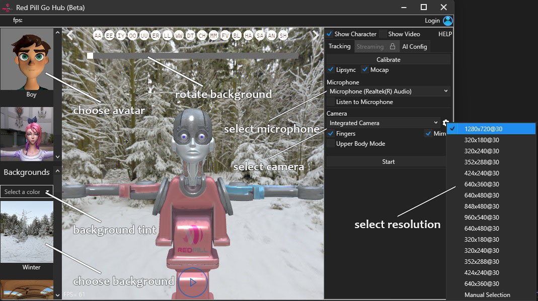 - "Virtual Camera" - when you install Red Pill Go Hub a new virtual camera device called RedPill-Camera is added to you system. When the Virtual Camera toggle is enabled this camera will display your live animation. The video resolution is 1280x720 in YUY2 pixel format. You can use this camera in video conferencing apps or websites such as meet, zoom, teams, etc. or broadcasting software such as OBS.