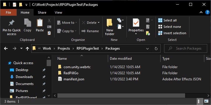 - Unzip RedPillGoPlugin.zip in your Unity’s project Packages folder