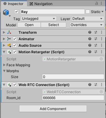- Attach Motion Retargeter Component to your character. Web RTC Connection and Audio Source will be attached automatically.