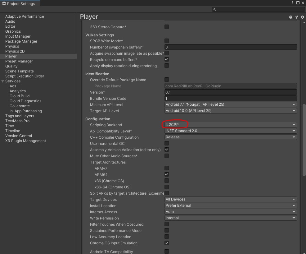 - When building for Android set the Scripting Backend to IL2CPP in Project Settings/Player/Other Settings/Configuration