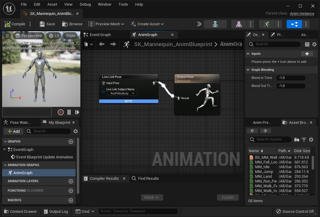 - Open the new Animation Blueprint and in the AnimGraph panel create a new LiveLinkPose node. Select RedPillGoBody as Live Link Subject Name and connect the output pin to Result pin in Output Pose.