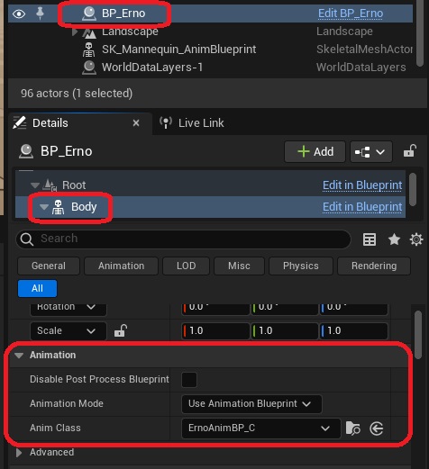 - Navigate to the Animation section and change Animation Mode to Use Animation Blueprint.