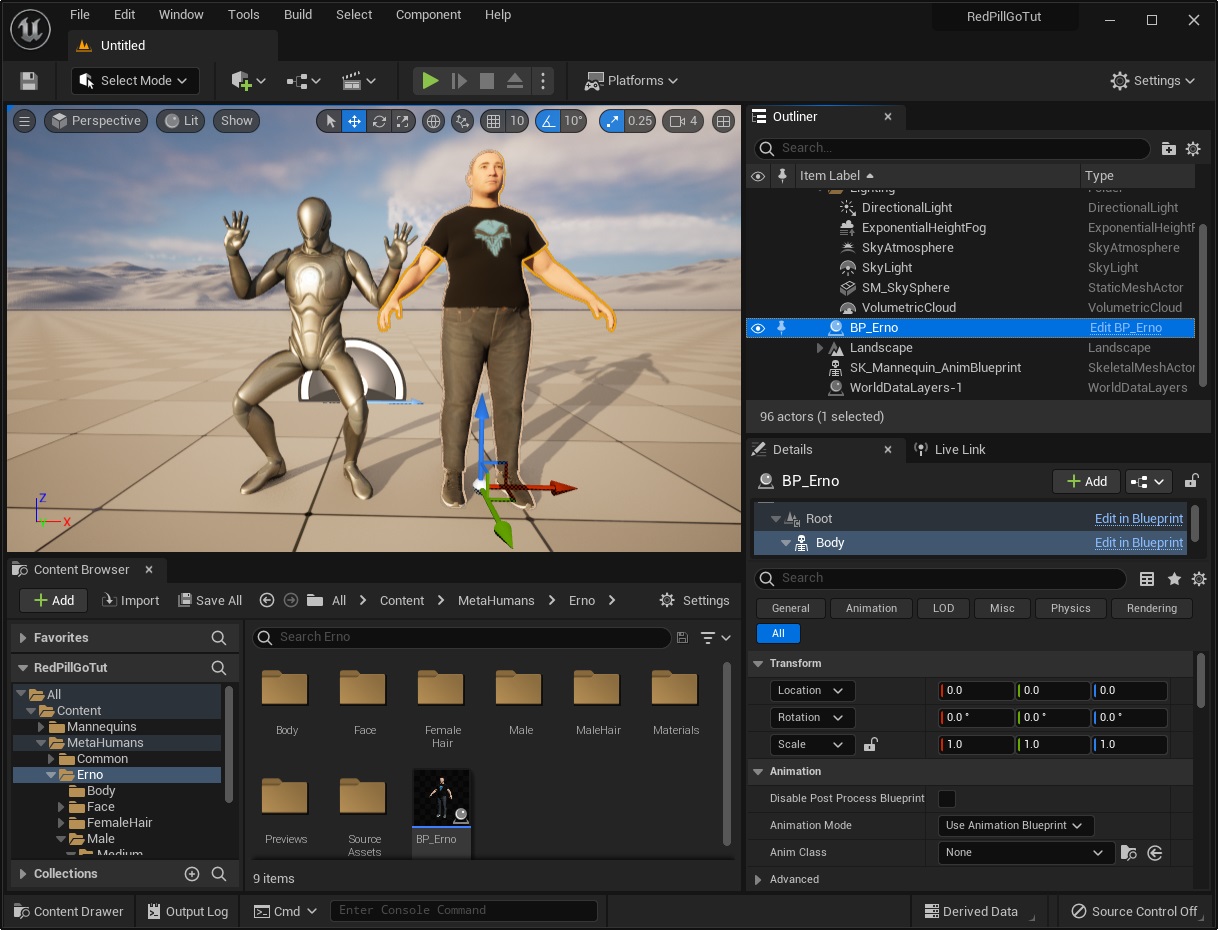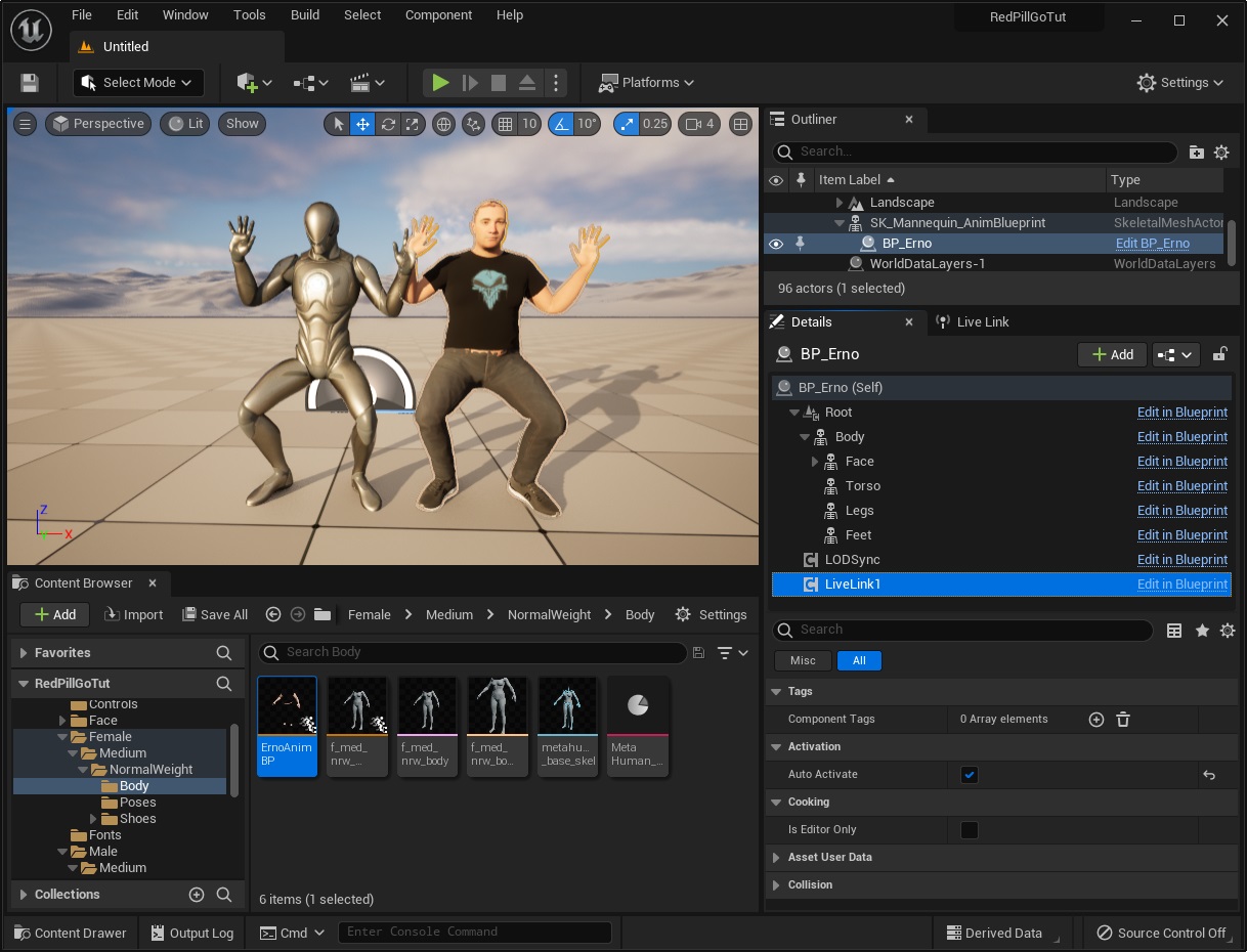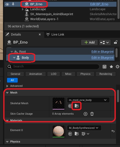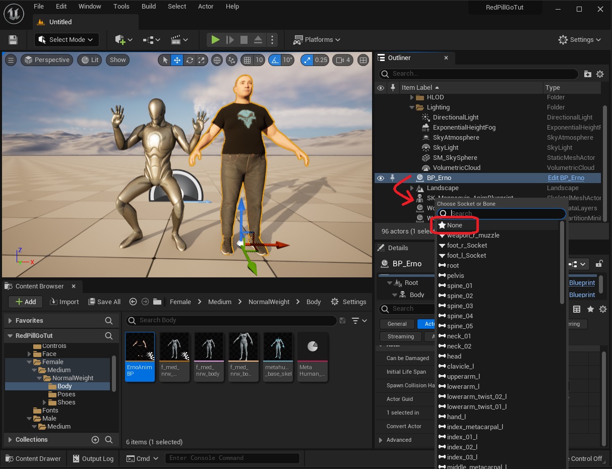 - Back in the Outliner Select the Metahuman and, in the details tab, select Body.