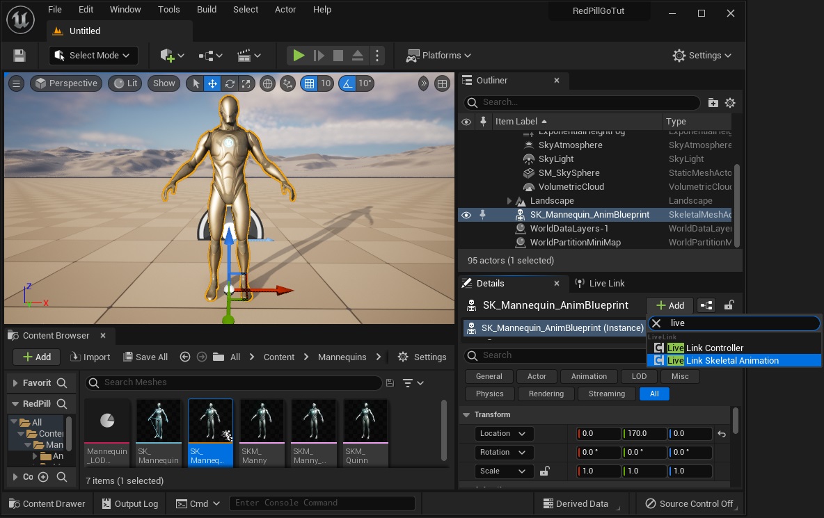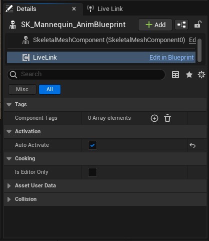 - Select the Mannequin in the Outliner then in the Details tab click +Add Live Link Skeletal Animation