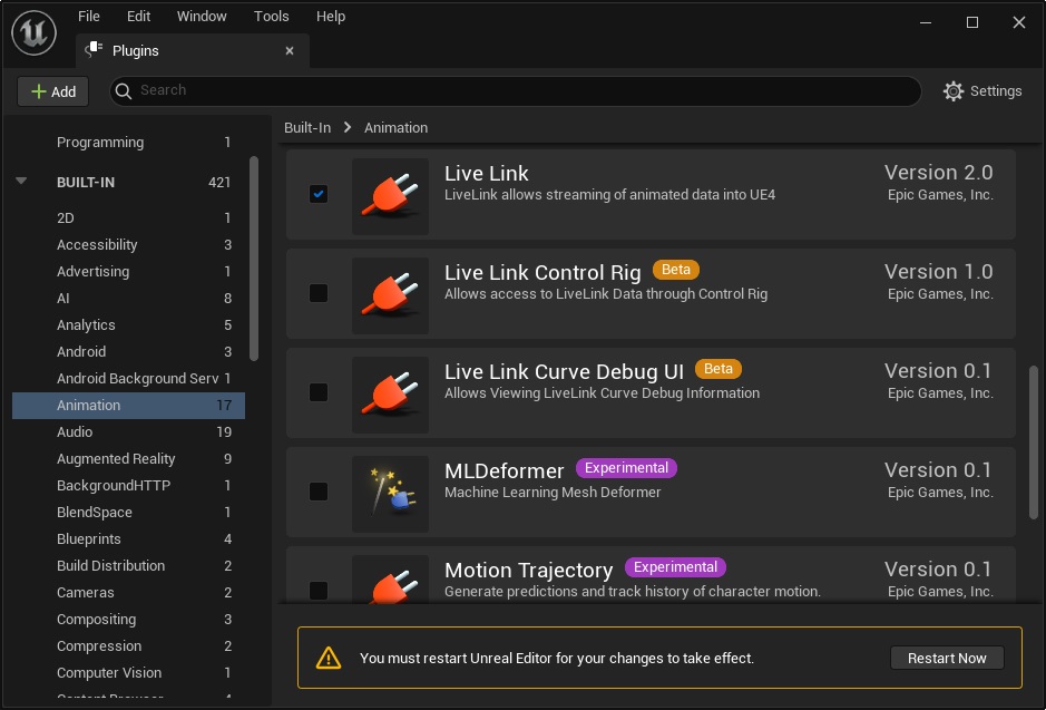 - Navigate to BUILT-IN > Animation. Here you should see LiveLink. Make sure to enable the plugin. This will prompt a restart.