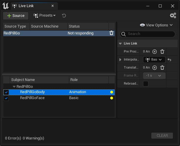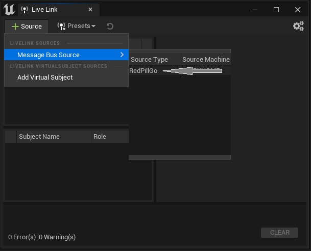 - In the Live Link panel, click on +Source > Message Bus Source > RedPillGo.
