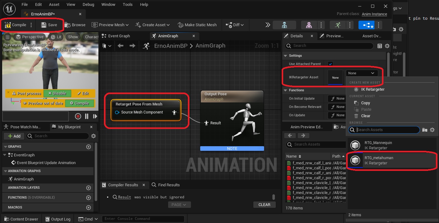 - Select the Retarget Pose From Mesh node and in the Details panel under Settings assign RTG_metahuman to IKRetargeter Asset