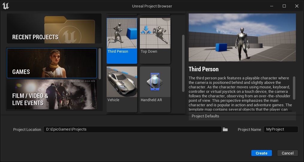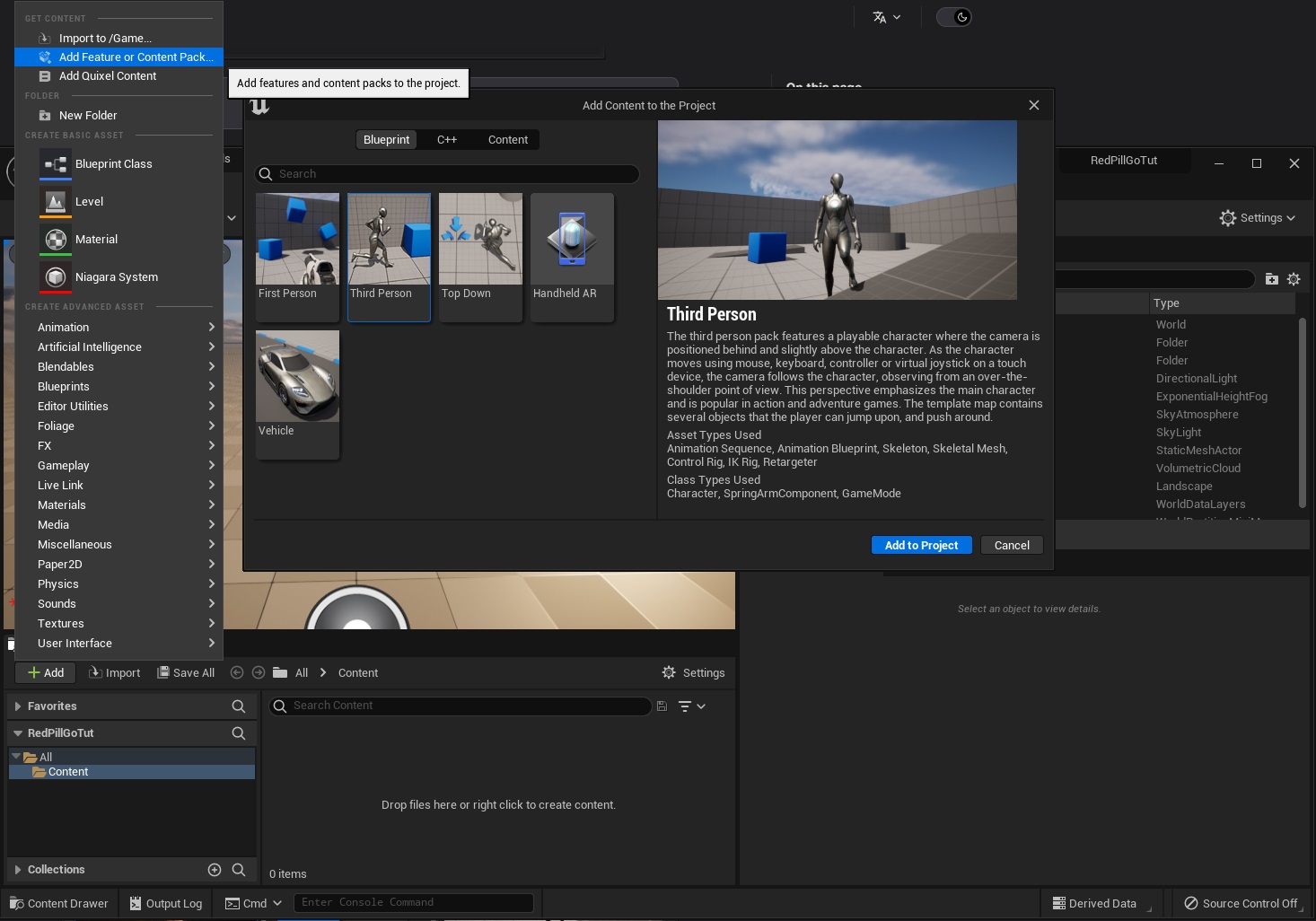 - In the Content Browser Click +Add > Add Feature or Content Pack > Third Person